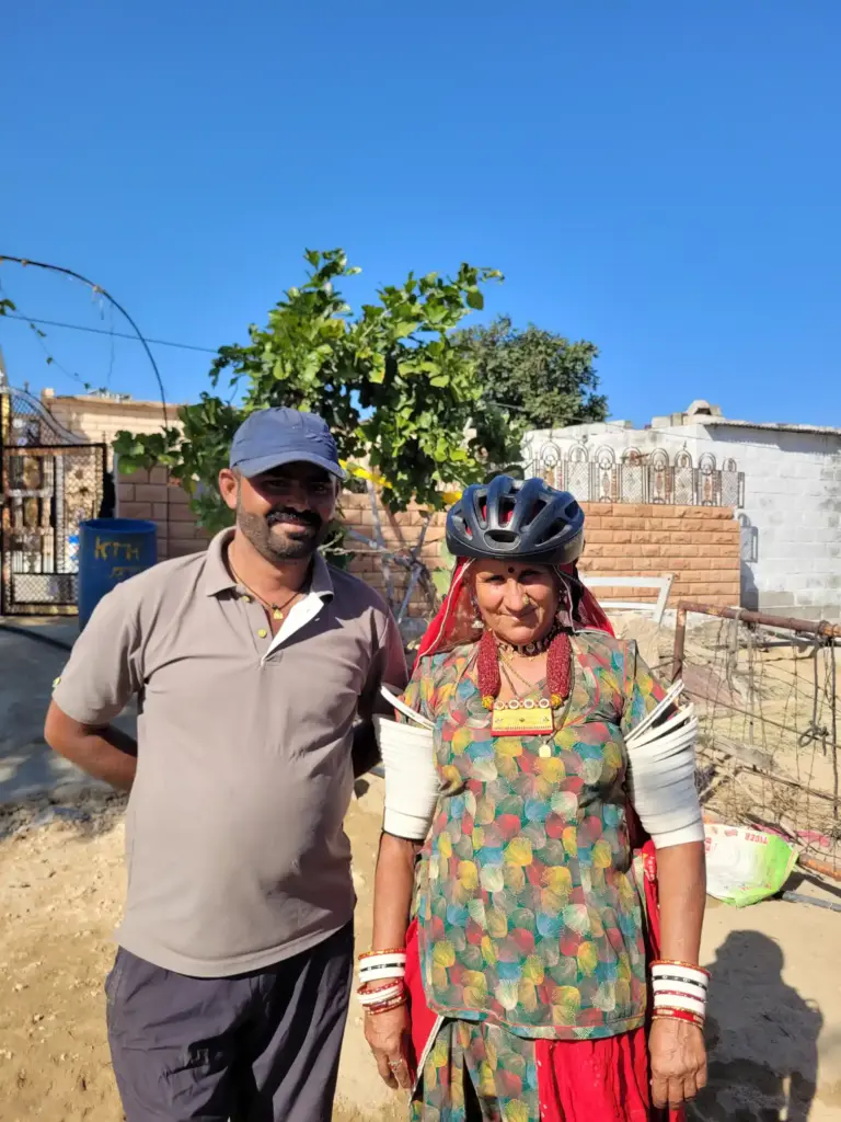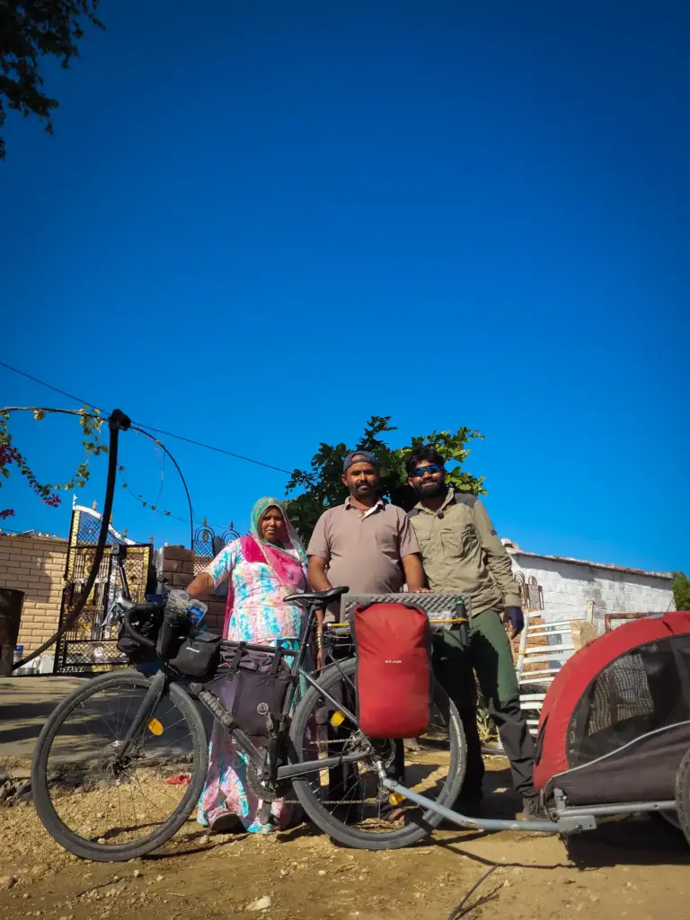 To explore freely, I had left my luggage and Bhairava’s trolley back at Kishan Bhai’s house, knowing I would return via the same route. On the way back, the desert decided to add one more challenge: Bhairava’s trolley tyre went punctured. After fixing things and reaching Kishan Bhai’s home again, I was treated to a delicious home-cooked meal. Knowing my interest in local culture, he even invited his aunt so I could photograph the traditional Rajasthani dress—cotton fabrics, natural dyes, heavy jewellery, and powerful colours that speak of centuries of identity and climate wisdom. Capturing those portraits felt like documenting living history, not just costumes.