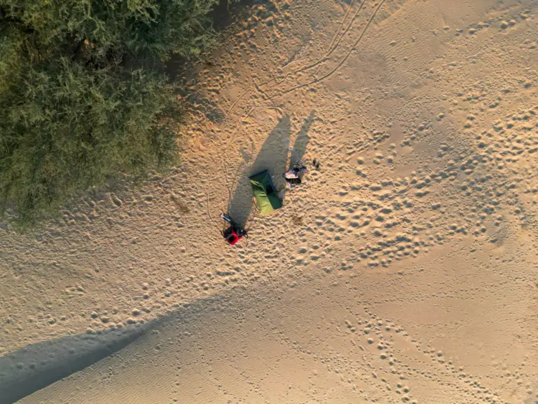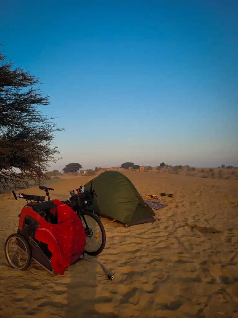 Day 110 started perfectly on the sand dune where I had camped. A small fire was set up in front of the tent, and as the sunrise unfolded, the sky transformed through stunning shades: deep dark blue giving way to fiery orange, then settling into clear blue. From the small hill-like dune, the vast depth of the desert stretched out below, making the moment feel endless and magical.