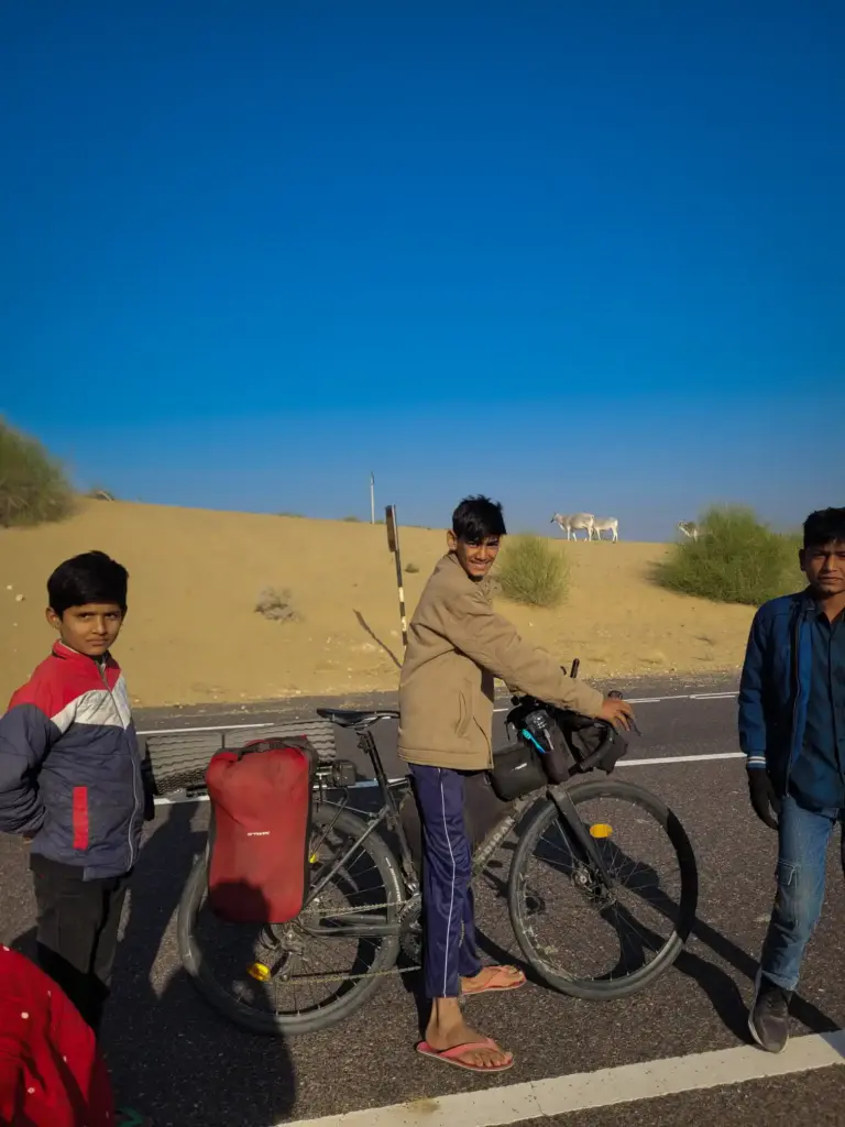 After the full sunrise, three boys appeared from the nearby settlement of Ratan Singh Ki Dhani in Gadra Road block of Barmer. Mahipal Singh (Class 7), Surendra Singh (Class 6), and Rahul Singh (Class 5) were full of curiosity but hesitant at first, whispering among themselves. When encouraged to ask questions, they opened up about the trip, the tent, Bhairava, and whether the cold night had been tough. “No,” they were told, “I have a complete setup.” Their smiles lit up as they took turns riding the bike and helping pack luggage down the dune till around 10 AM.