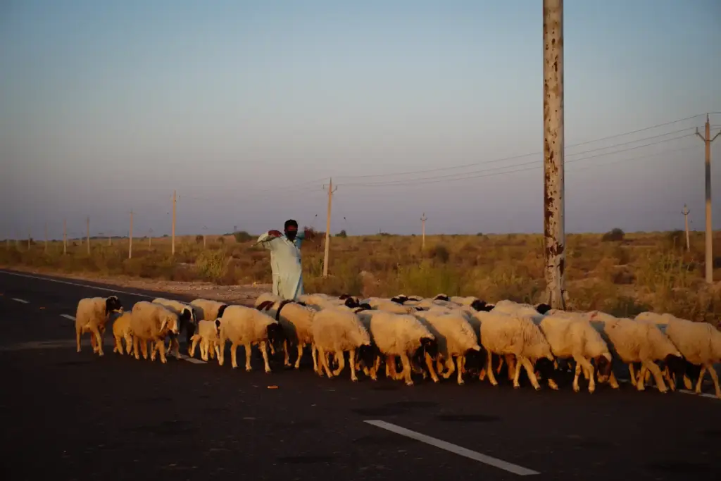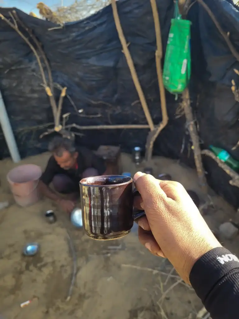 Descending to the main road, random people called out along the way, offering chai and curious conversation. Near a sheep shelter, it became clear how desert pastoral life works: villages stay central while sheep graze 5-10 km away in open desert, herders rotating between settlements and grazing grounds.