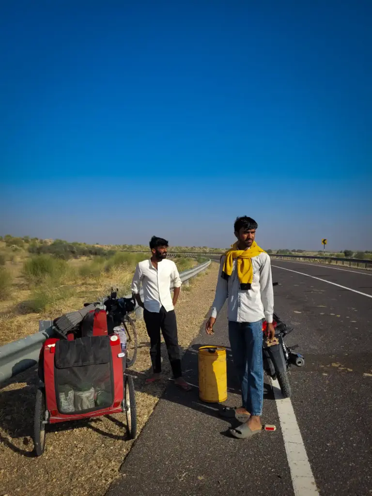 Nepal Singh, one of the chai-offering men, invited me for lunch at his nearby village, Lunar. I took his number and arrived to a warm welcome: bajra roti, curd curry, ghee, and jaggery—the full Rajasthani hospitality spread. After eating heartily (Bhairava too), I continued, exchanging words with countless people along the road.