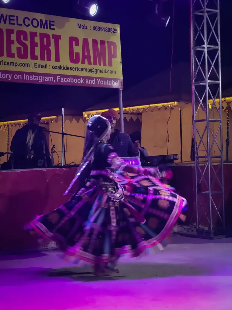 By evening, I reached Ozaki Desert Camp in Sam village, checking in for a comfortable 10th stay that included food—a welcome break from tent life. The camp organized authentic Rajasthani cultural performances: desert folk singing, traditional dances with ghungroos and dholak rhythms, bright turbans swirling under lantern light. Me and Bhairava spent the night immersed in Thar Desert heritage, the day’s encounters—from dune schoolboys to village feasts—flowing perfectly into this cultural finale.